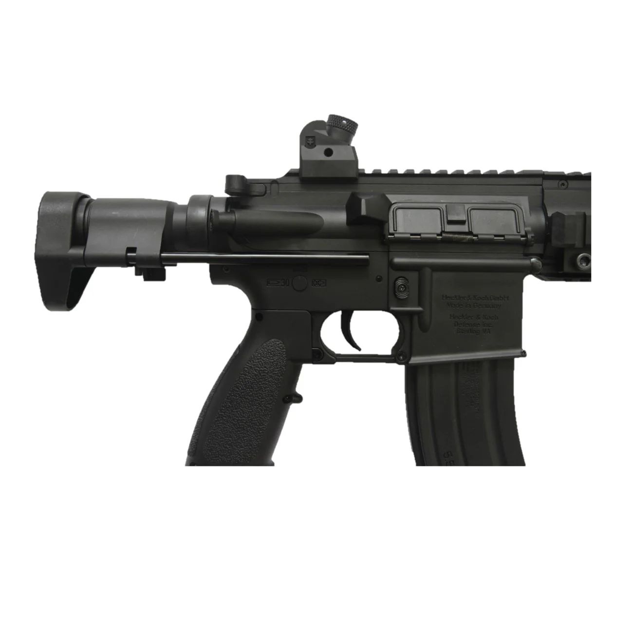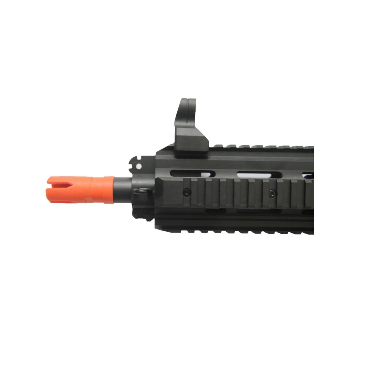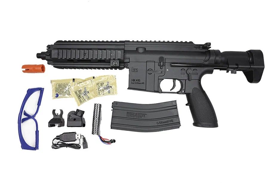 Копия боевого прототипа HK416 в масштабе 1 к 1. Корпус автомата полностью из ABS пластика. Все компоненты стандартные и совместимы с запчастями большинства других производителей. На цевье и на ствольной коробке 5 планок Пикатинни-Вивера, на которые можно установить любое доп. оборудование: лазерный целеуказатель (ЛЦУ), фонарики, тактические рукоятки, Приклад регулируется по длине.