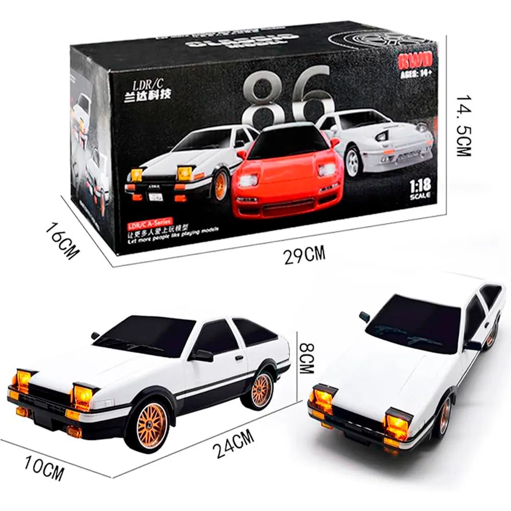 Оригинальная модель AE86 — это Corolla запущенная в производство в 1983 году. Модель выполнена в масштабе 1:18, а внешний вид выполнен в соответствии с фактическими пропорциями. Применяется многорычажная конструкция подвески, которую можно регулировать, передние и задние колеса можно наклонять внутрь и наружу, выдвигающимися фарами (как у настоящего авто) можно управлять с помощью пульта дистанционного управления. Машинка имеет полностью пропорциональное управление как ускорения, так и поворота колес. Плата аккумуляторной батареи имеет защиту от перезаряда и переразряда, защиту от низкого напряжения. Оснащен литиевой батареей 7,4 В, 500 мА, USB-кабелем для зарядки, двигателем 150 класса.