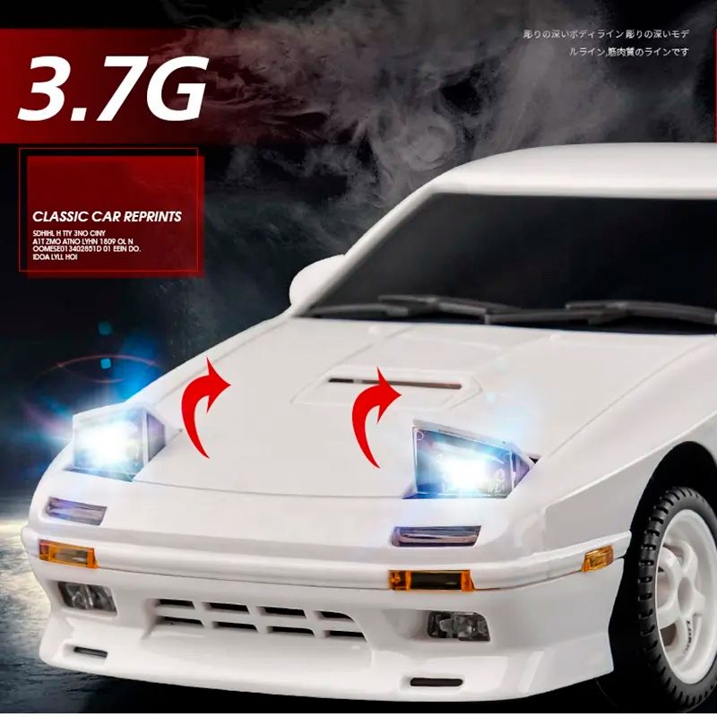 Модель для дрифта на пульте управления - классический кузов RX-7. Имеет высокую детализацию. Задний привод 2WD с мощным коллекторным мотором. Поднимающиеся фары со светодиодными огнями. Встроенный гироскоп для курсовой устойчивости во время дрифт заездов.