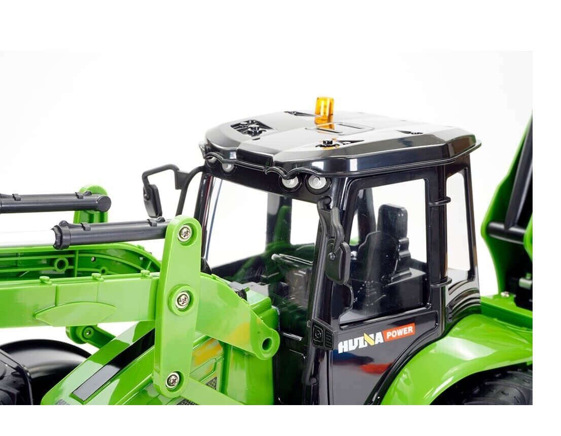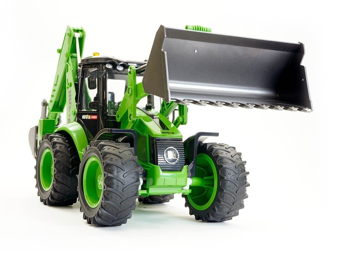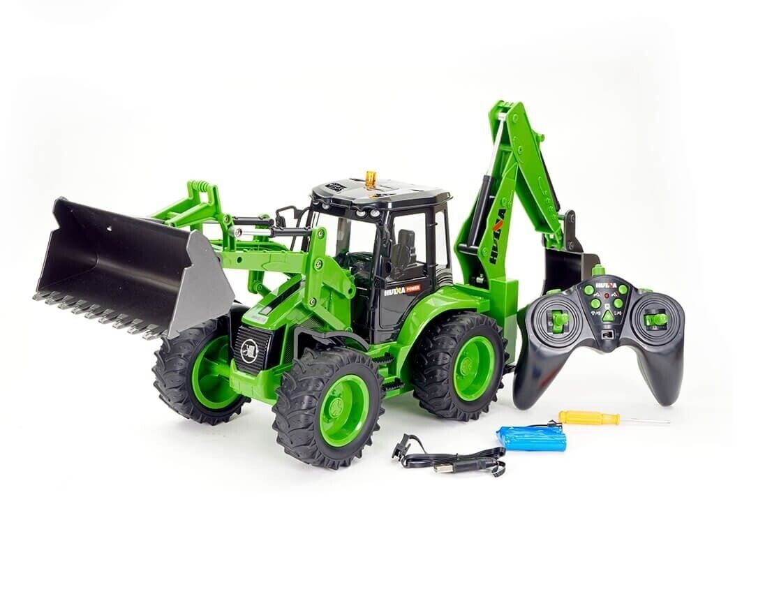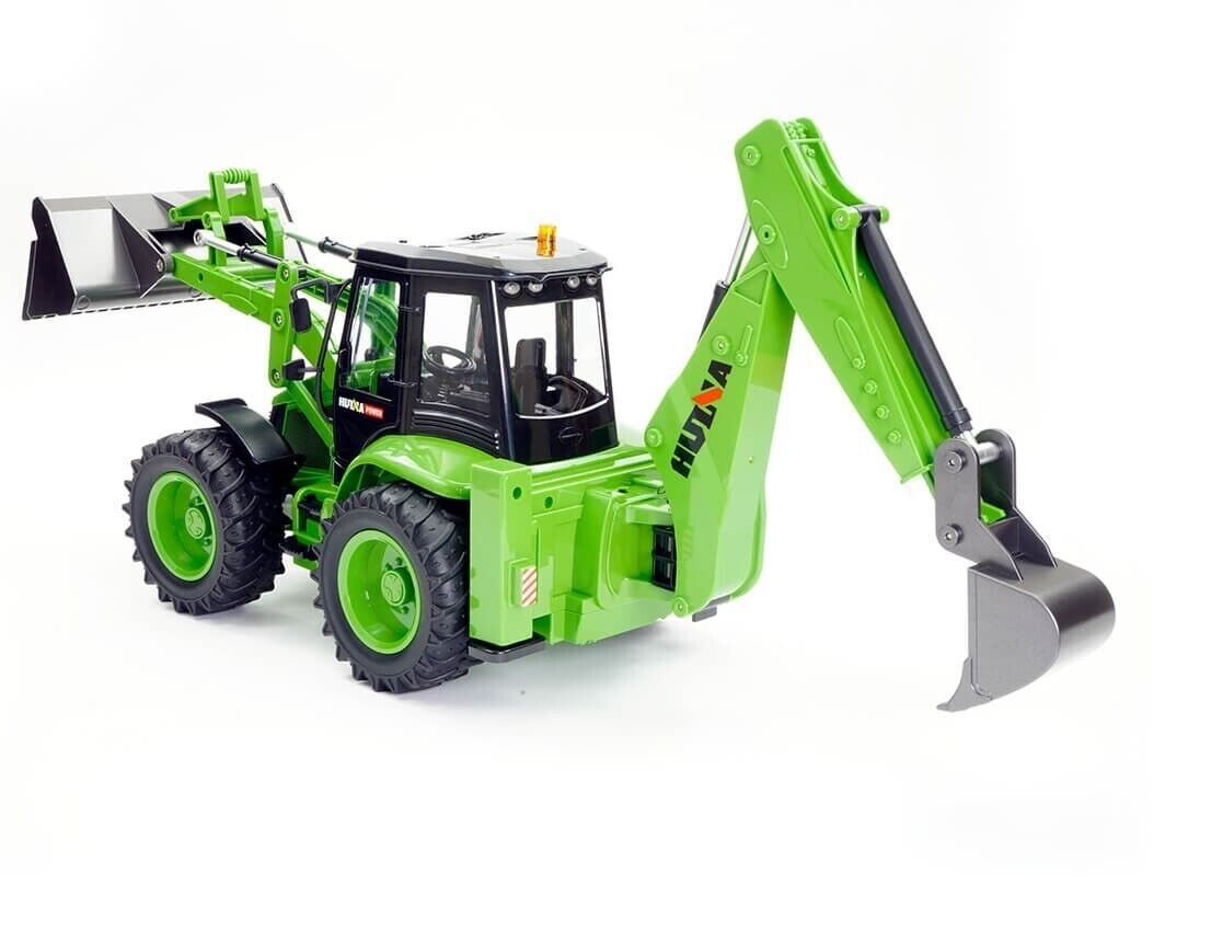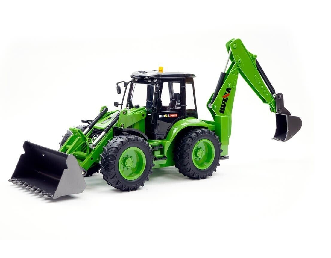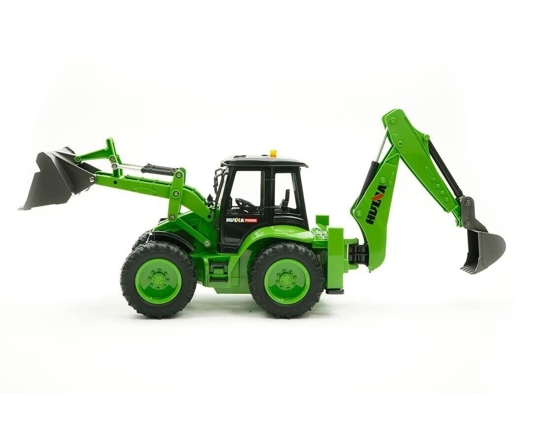 Экскаватор-погрузчик на радиоуправлении производства известного на рынке игрушек производителя HUINA TOYS - копия экскаватора-погрузчика. Имеет строительный зелёный стиль. Игрушка полностью функциональная, а все ее действия управляются с пульта. Может двигаться вперед/назад, вправо/влево. Прекрасно передвигается почти по любым поверхностям. Принцип движения полностью повторяет настоящую технику. Ковш перемещается вверх/вниз, может зачерпывать. Благодаря погрузчику можно перевозить предметы на небольшие расстояния. Особенности: Имитация работы двигателя Поднимает и опускает ковш