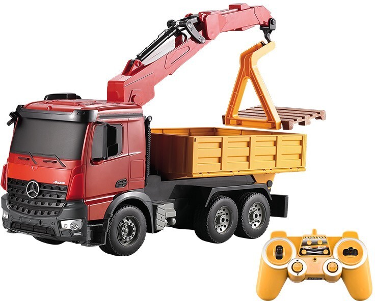 Большой грузовик (длина 38 см) будет прекрасным подарком для любого начинающего строителя. Это очень функциональная и точная копия Mercedes-Benz, которая официально лицензирована производителем. Радиоуправляемый кран может двигаться в направлении вперед/назад, вправо/влево. Кран может подниматься и опускаться, регулируется высота.
