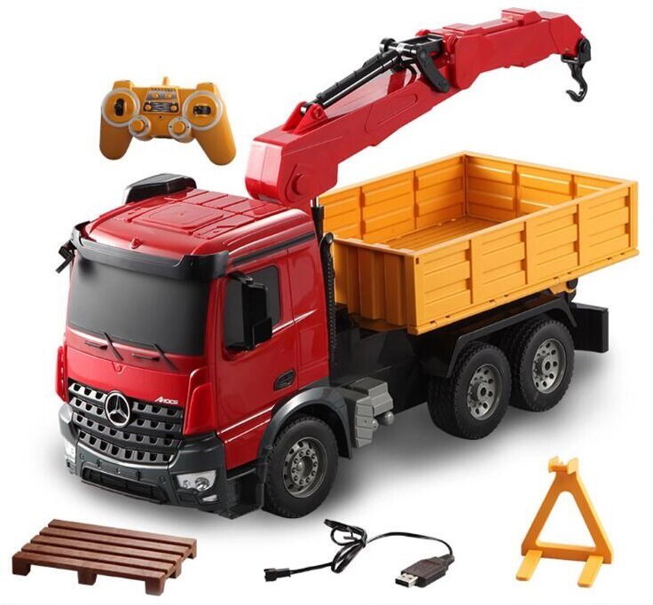 Данная модель точная и функциональная копия крана погрузчика Mercedes-Benz в масштабе 1:20. С пульта можно управлять не только движениями самого грузовика, но и движениями крана.