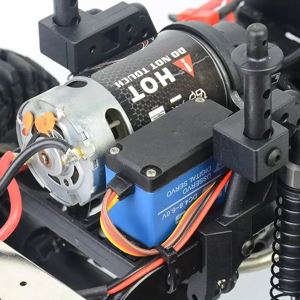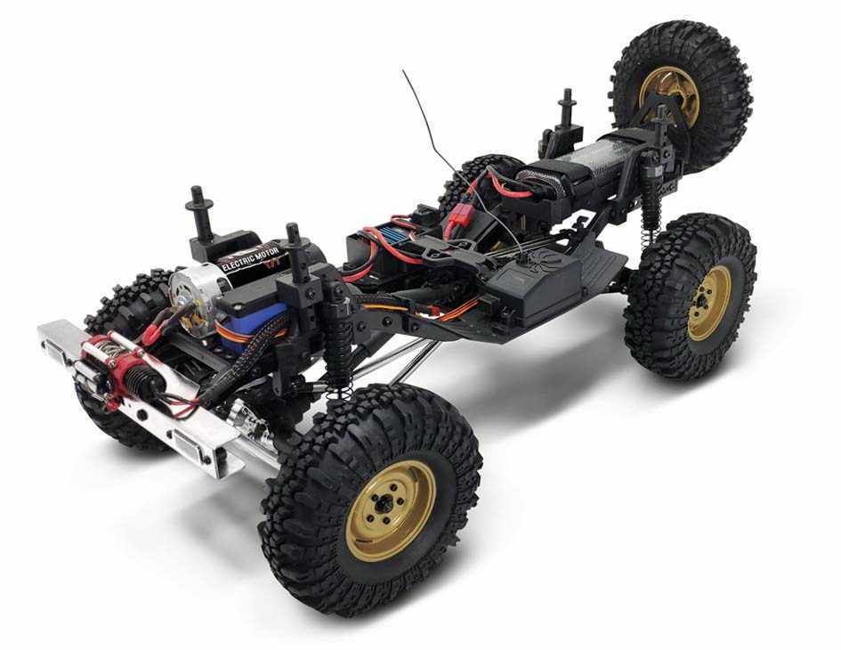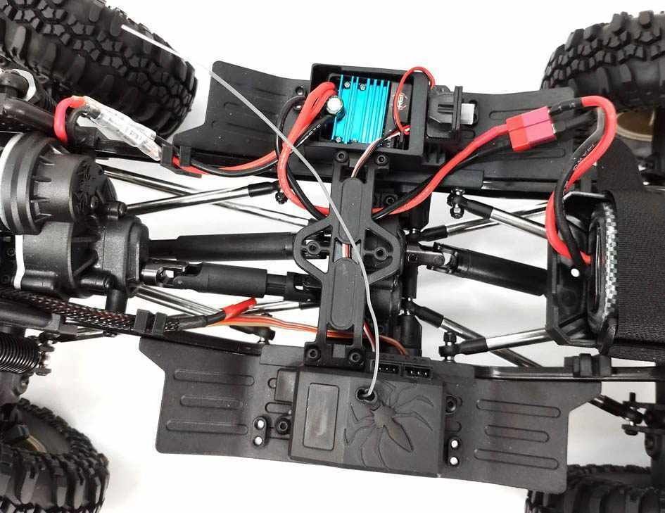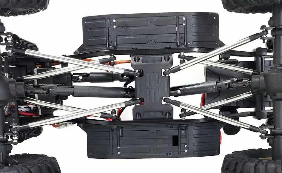 Внедорожник подготовлен для эксплуатации в сложных условиях. Электронный регулятор скорости с влагозащитой, сервопривод рулевого управления с защитой от воды и песка, карданный постоянный полный привод 4WD с дифференциалами из металла, кардан и крестовины из нейлонового композита, защита трансмиссии от попадания песка и камней. Тяги выполнены из анодированного алюминия, а жесткость рамы достигается применением элементов из металлического сплава.