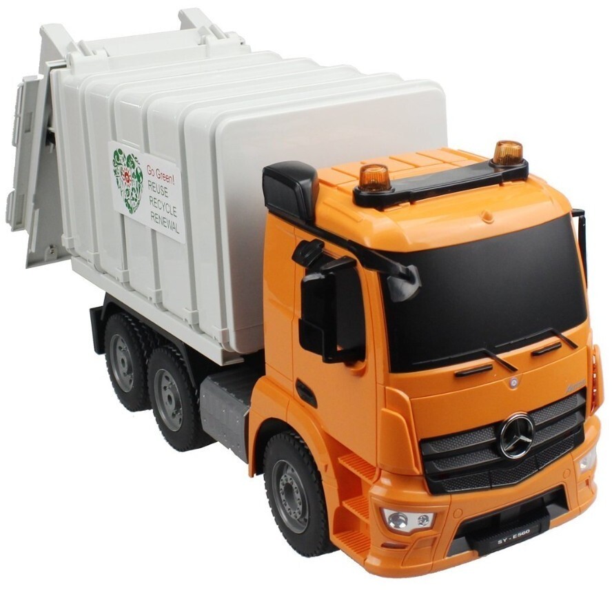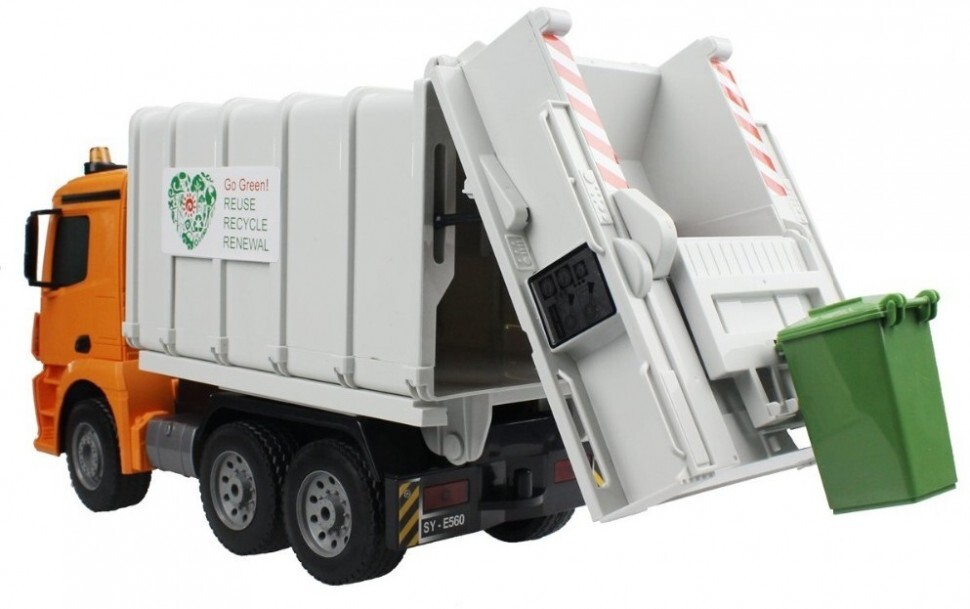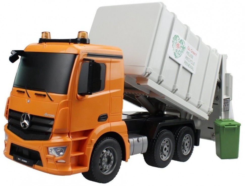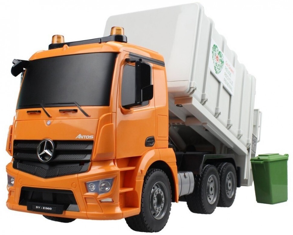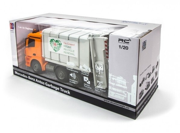 Радиоуправляемый мусоровоз Double E Mercedes-Benz Antos 1:20 2.4G - E560-003 - это уникальный игрушка мусоровоз по лиценции Mercedes-Benz, которая является точной копией грузовика Mercedes-Benz Actros выполненной в масштабе 1:20. Многоканальный пульт дистанционного управления позволяет контролировать движение машины вперед/назад и вправо/влево. Кузов модели поднимается вручную, чтобы можно было высыпать содержимое.
