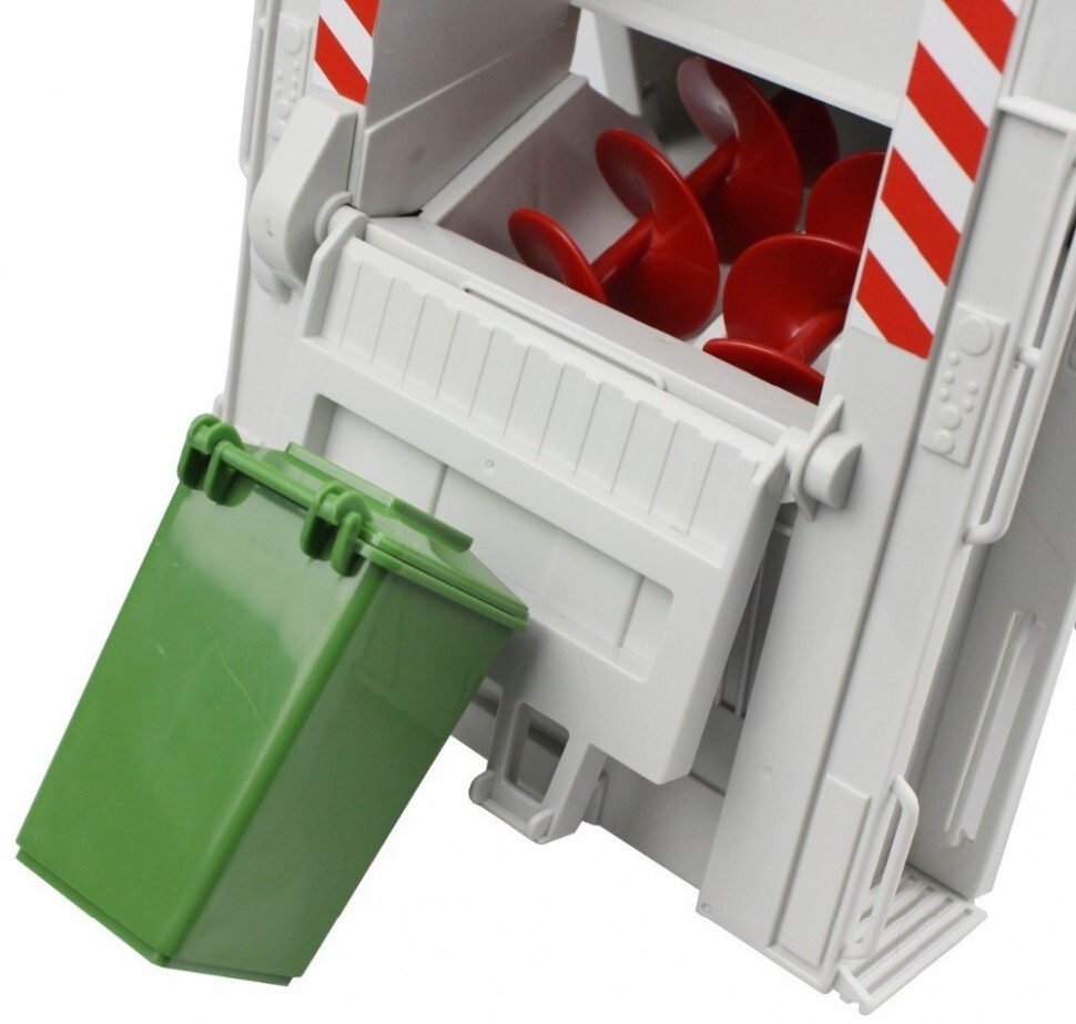 Мусоровоз издает звук работы двигателя и другие звуковые сигналы, которые можно отключить. На кабине работают светящиеся маячки, в комплекте имеется комплект мусорного контейнера..