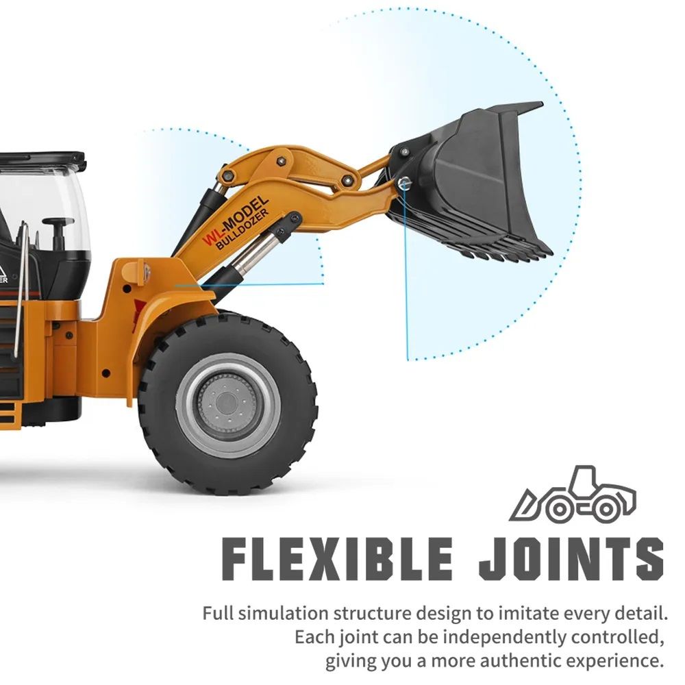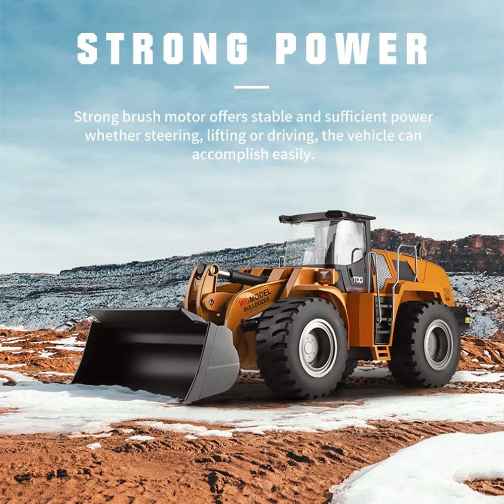 Игрушка полностью функциональная, а все ее действия управляются с пульта. Может двигаться вперед/назад, вправо/влево. Прекрасно передвигается почти по любым поверхностям. Принцип движения полностью повторяет настоящую технику. Ковш перемещается вверх/вниз, может зачерпывать. Благодаря погрузчику можно перевозить предметы на небольшие расстояния.
