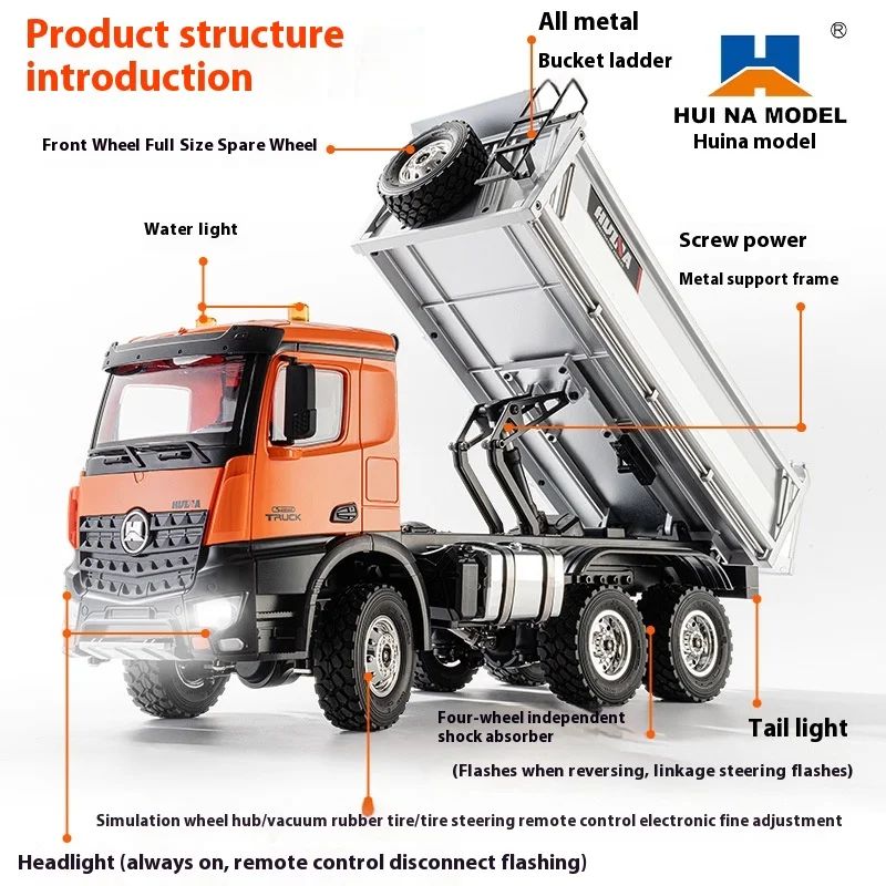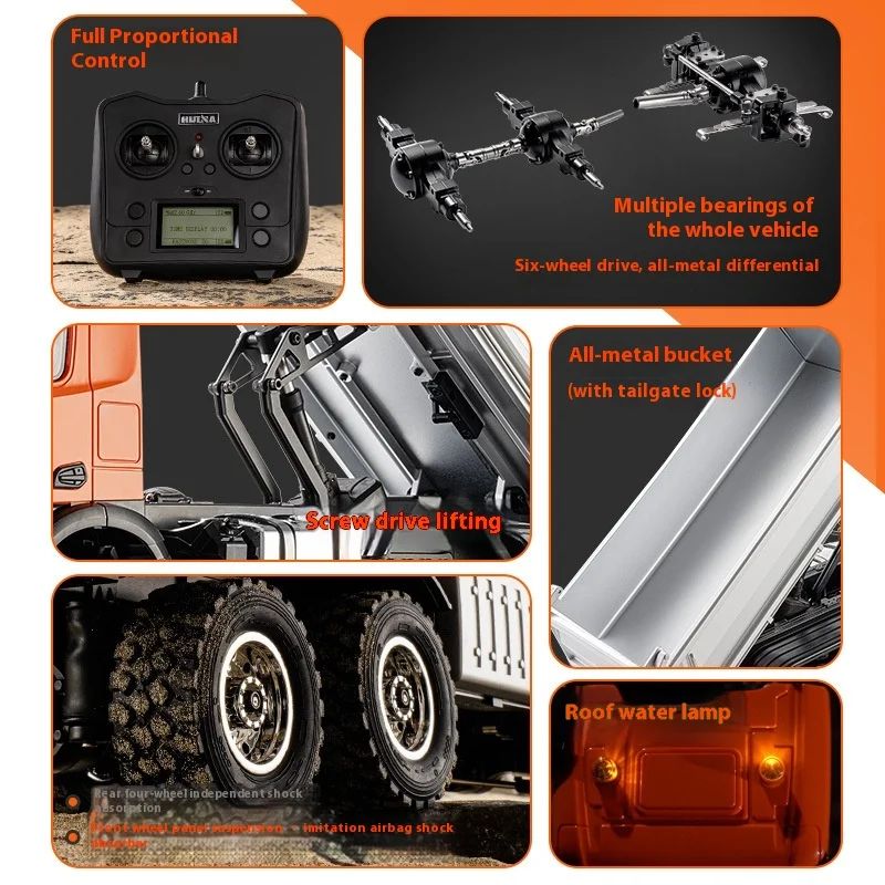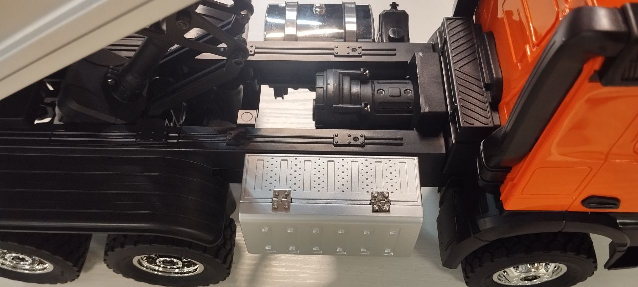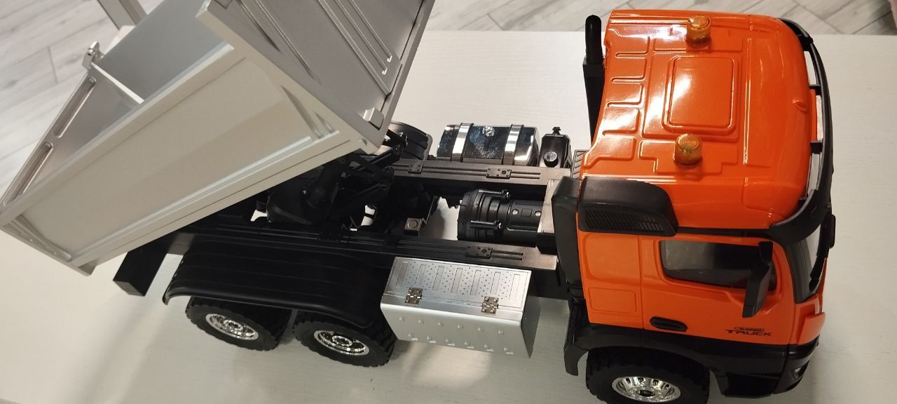 Мощный радиоуправляемый самосвал в масштабе 1/14 с вместительным кузовом, способным перевозить грузы и сыпучий материал. Самосвал выполнен очень реалистично. Обладает высокой проходимостью благодаря полному приводу 6WD. Такое решение позволяет избежать проскальзывания передних и задних колес одновременно .Управлять устройством можно при помощи пульта на частоте 2,4 ГГц. Так же с пульта управляется поднятие кузова грузовика. Вы сможете загрузить кузов вручную или при помощи экскаватора, перевести на нужное место и выгрузить автоматически.Функциональность игрушки не оставит равнодушным даже взрослого. Машина имитирует звуковые сигналы, поднимает и опускает кузов, а также оснащена светящимися фарами.