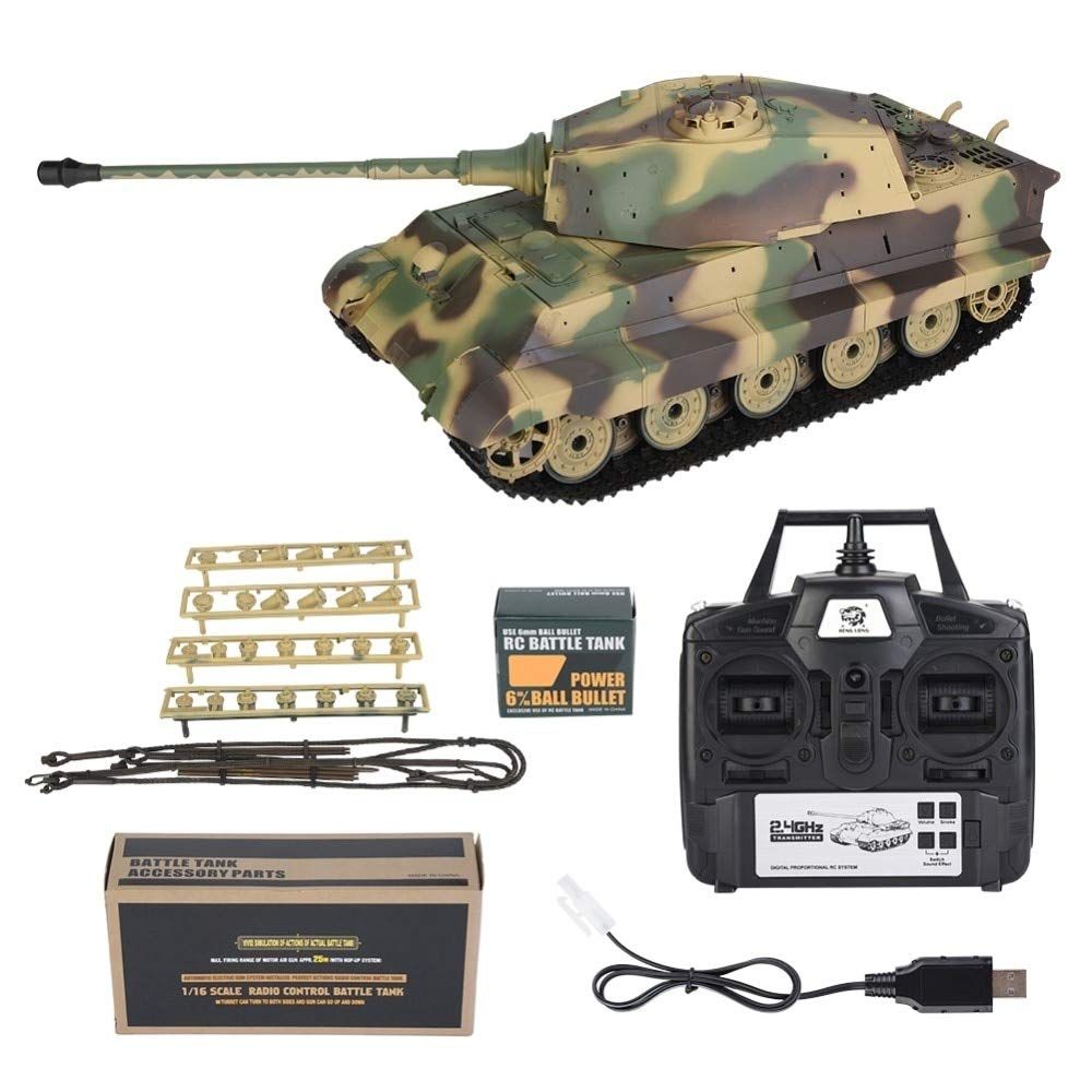Радиоуправляемый танк Heng Long King Tiger V7.0 масштаб 1:16 2.4G - 3888A-1 V7.0 - это танк German King Tiger Henschel Turret (Королевский тигр с башней типа Henschel) изготовлен в точном соответствии с известным немецким тяжелым танком, имеет прекрасно детализированный корпус с множеством дополнительных навесных аксессуаров.